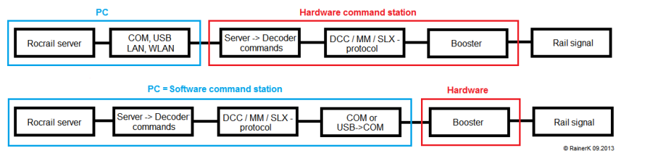 A Command Station is a device that converts the orders of a person or computer into the correct protocol and then sends them to the decoders on a layout. A person gives orders by using a controller connected to the Command Station. A computer gives orders by sending them through a cable connected to the Command Station.