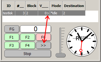 Note: 'Reverse' in this case refers to the running direction of the loco! The direction of movement nevertheless is forwards. The latter is indicated by the arrow head in the velocity column pointing to the right while the running direction of the loco is indicated by the negative sign:-0>.