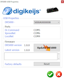 - de tijd tussen het inschakelen van het systeem en het starten van Rocrail is te kort, de DR 5000 moet enkele ogenblikken met rust worden gelaten totdat alles bedrijfsklaar is.