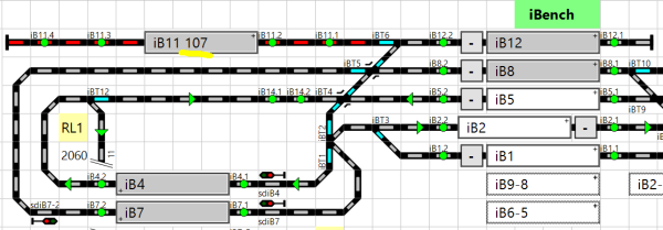 - Zielbahnhof: Im Zielbahnhof 'iBench' wird der Zug manuell rangiert und es können z.B. Wagen auf den Auszugsgleisen 'iB11, iB12' abgestellt werden.