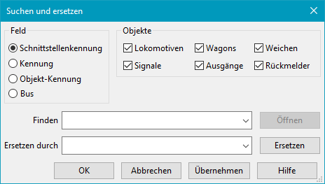 Wenn das Feld "Kennung" ausgewählt ist, werden Objekte gesucht, deren Kennung mit dem Wert der "Finden"-Box beginnt und der Eigenschafts-Dialog wird geöffnet.