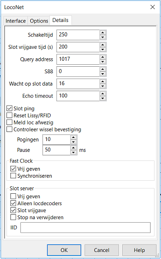 In de tab Details is de enige relevante optie de Slot Vrijgave Tijd: Locomotieven die niet in gebruik zijn als de tijd als gedefiniëerd in de Intellibox is verstreken. De optie Slot Vrijgave Tijd kan worden gebruik om dit te voorkomen. De waarde die ingevoerd wordt bij Slot Vrijgave Tijd mag ten hoogste gelijk zijn aan, maar bij voorkeur iets lager dan de tijds ingesteld op de Intellibox.