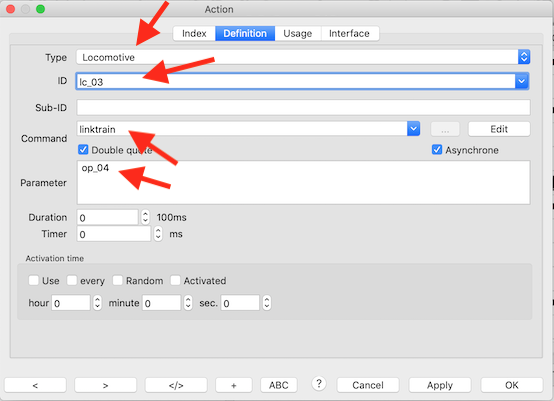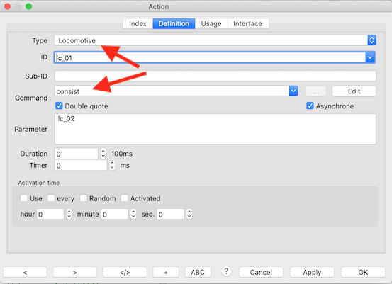 Het Rocrail plan bevat voorbeelden in XML-formaat voor "multi tractie (consist)" , "wijs trein toe" en "koppel trein".