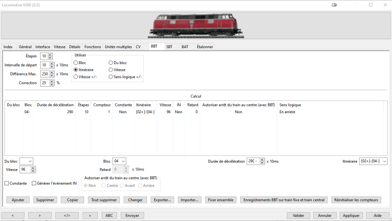 - Aprés avoir édité la locomotive duTrain le BBT calculé précédemment ne sera plus adapté en raison de la charge modifiée; Des arrêts d'apprentissage supplémentaires sont nécessaires.