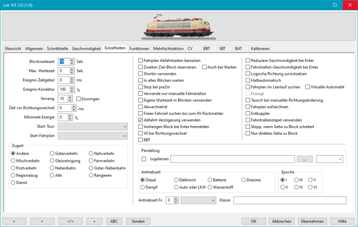 - Übersicht | Allgemein | Schnittstelle | Geschwindigkeit | Einzelheiten | Funktionen | Mehrfachtraktion | CV | BBT | SBT | BAT | Kalibrieren | Wartung | Rangiermodus