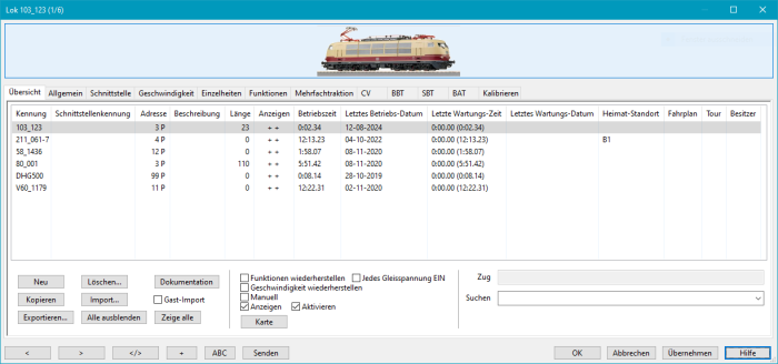 - Übersicht | Allgemein | Schnittstelle | Geschwindigkeit | Einzelheiten | Funktionen | Mehrfachtraktion | CV | BBT | SBT | BAT | Kalibrieren | Wartung | Rangiermodus