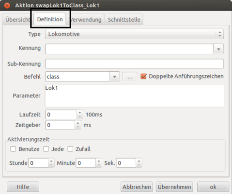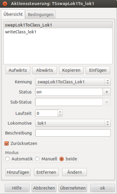 Es wird in diesem Beispiel nur die Lokomotive lok1 Verwendung finden. Daher bietet es sich an, auch für Übungszwecke, die Schritte auf dem eigenen System für lok2 selbst nachzuvollziehen. Am Beispiel der Aktion 'swapLok1ToClass_Lok1' wird aufgezeigt, wie das funktioniert.