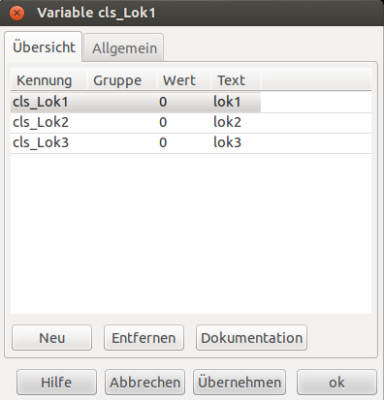In dem hier beschriebenen Verfahren werden drei Variablen benötigt, je eine für die zu vergebene Klasse. Angelegt werden diese mittels Tabellen → Variablen-Tabelle → Neu. Der besseren Übersicht wegen, sollten diese Variablennamen mit einem cls für Class beginnen. Jede Variable erhält im Registerblatt Allgemein im Feld Text des Dialoges je den Wert 'lok1', 'lok2' oder 'lok3'. Auch hier gilt wieder: Übernehmen→ Ok nicht vergessen.