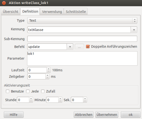 Als Namen könnte 'writeClass_lok(x)' verwendet werden. Das x im Namen steht für die Zahl in der Klasse. In das Feld Kennung kommt die Kennung des Textfeldes, es wurde txtKlasse vergeben, als Befehl wird update ausgewählt. Das Feld Parameter wird mit dem Text des Klassennamens beschrieben.