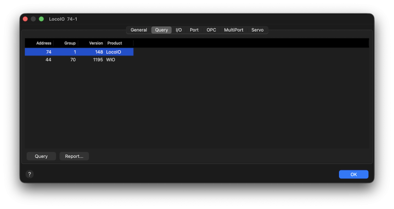 The query button broadcast a get SV 0 at address 0/1 and all connected LocoIO based modules will respond and are listed.