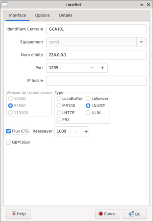 La configuration de l'interface dépend du type de connexion LocoNet: RS232, USB ou Socket.
