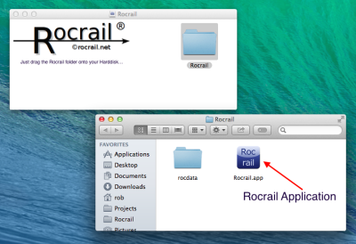 - Open de dmg en sleep hem naar de Rocrail Folder op je desktop of ergens anders