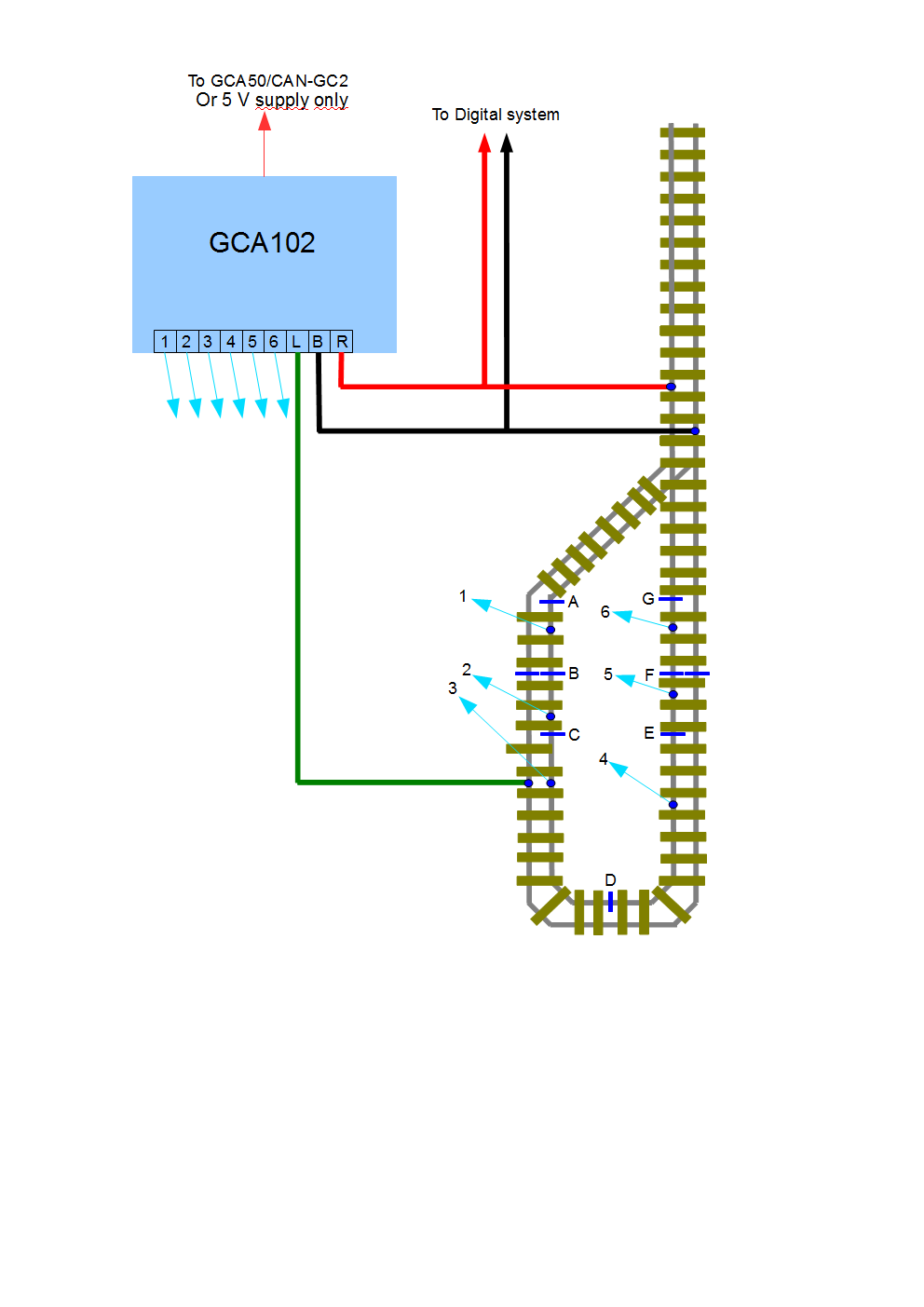 Als de sectie wordt ingereden, polariseert GCA102 de spanning in de lus (inclusief secties 2,3,4,5) zodanig, dat de trein rustig ectie 2 kan binnenrijden zonder dat kortsluiting ontstaat.
