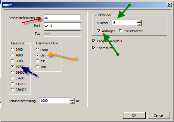 - Hardware Flow → "cts" ist für diese Zentrale fest einprogrammiert - oranger Pfeil