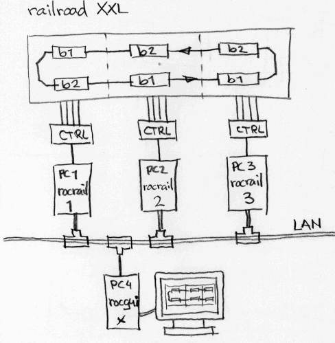 Normally every Rocrail server will have its own Rocgui to control the layout section it is resposible for.