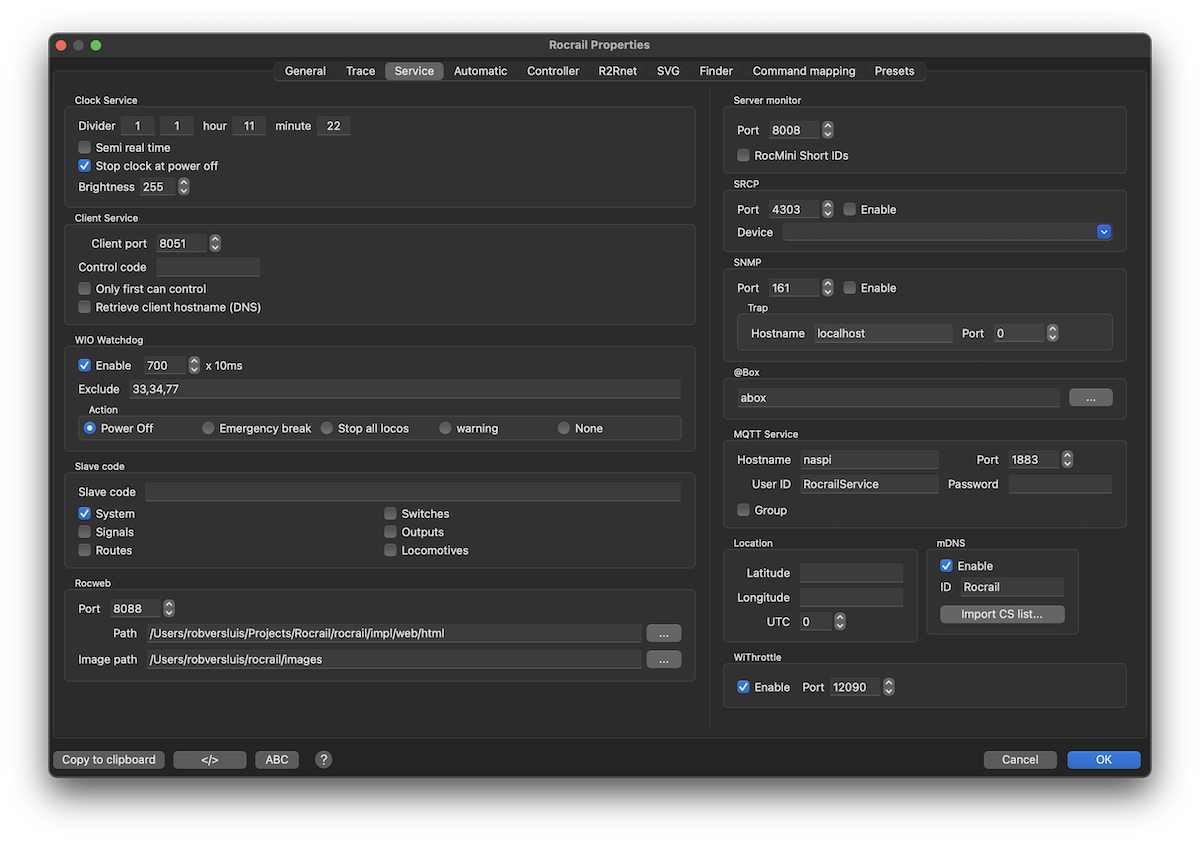 - define MQTT Hostname "localhost" and Port "1883" when running MQTT on the same machine as Rocrail
