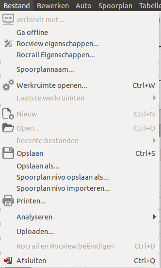 note: Als bij Opslaan als… het spoorplan wordt opgeslagen onder een andere naam of een andere locatie dan het huidige spoorplan. Dan moet de verwijzing in de rocrail.ini handmatig ook worden aangepast en de server moet worden herstart.
