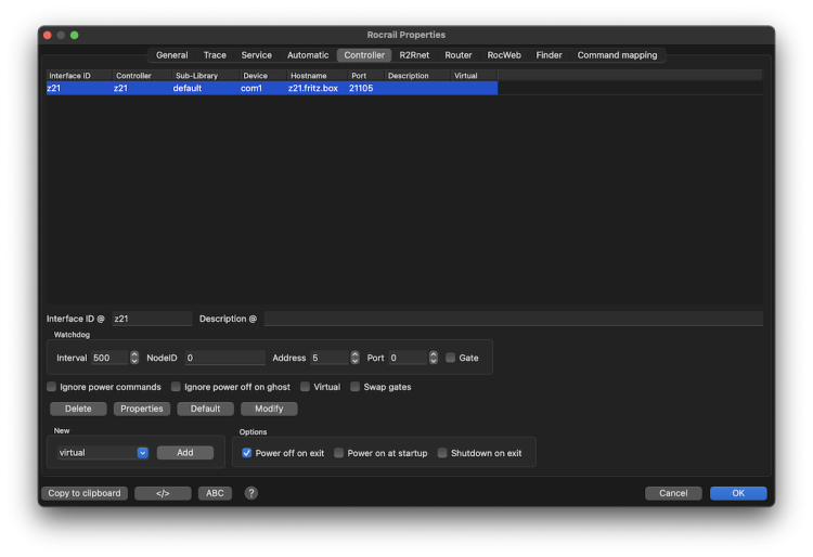 The properties dialog is Commands Station type dependent and is described in the Command Stations section.