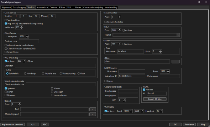 Schakel de WiThrottle‑ondersteuning in Rocrail in. (Hiervoor is een herstart van de server nodig.)
