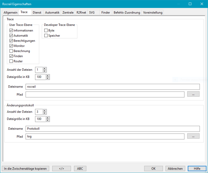 Diese Einstellung ist nur für Entwickler. Der gesamte Datenaustausch zwischen Rocrail und der/den Zentrale(n)wird auf Byte-Ebene ausgegeben.