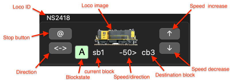 The fields "Block", "Speed", "Mode" and "Destination" are equal of contents as in the Loco Tab grid.
