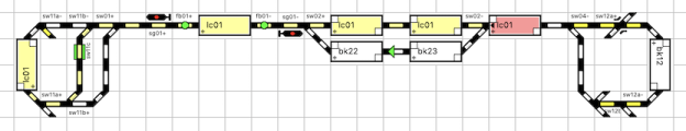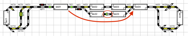 The locomotive runs from right to left - from block bk04 (plus side) to block bk01 (minus side) with the via blocks bk03 and bk02.