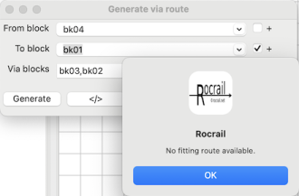 The dialog can be opened by clicking to "Rocview Menu → Track plan → Generate via route…"