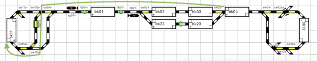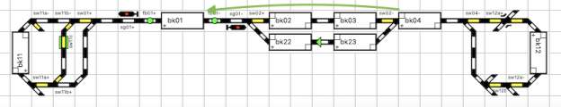 The locomotive runs from right to left - from block bk04 (plus side) to block bk11 (plus side) with the via blocks bk03 and bk02 and bk01.