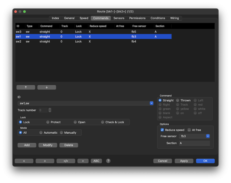The listed commands are executed from top to bottom of the list. It is advisable to move signal commands to the end of the list so that they are executed after the switches have been set.