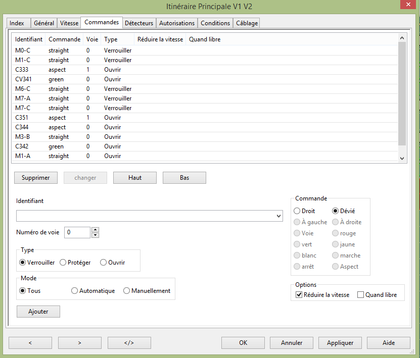 Les commandes sont exécutées dans l'ordre du haut vers le bas de la liste. Il est conseillé de placer les commandes de signal à la fin de la liste comme cela elles seront exécutées après que les aiguillages aient été positionnés.