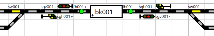 | Die Grafik zeigt die Positionierung von Rückmeldern (fb) sowie Vor- (sgv) u. Haupt- (sgh) Signalen für einen Block (bk). Die Rückmelder und Signale werden damit dem Block und den Fahrstraßen beider Blockseiten korrekt zugeordnet. Auf beiden Blockseiten müssen die Rückmelder und Signale zwischen dem Block und der nächsten Weiche (sw) positioniert sein. Die Reihenfolge der Objekte zwischen Block und Weiche ist beliebig. |