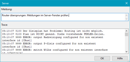 Server-Trace bei "Router" mit typischem Fehler beim Entwurf des Gleisplans: