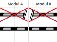| L'utilisation possible auparavant des nombres 0…9 pour de multiples paires de traversées conduit à l'arrêt du Routeur. Le positionnement orthogonal et les surfaces coupées se faisant face des même symboles ne sont plus considérés. Ceci inclut également un élément de pont divisé (tracknr 2). Pour que le plan de voies pour le Routeur soit "sain" et les appariements précédents restent valables à l'avenir, l'"ancienne" paire de traversée 0…9 doit être changée en une numérotation unique pour tous les niveaux dans le plan de voies entier. |