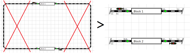 En plus, placer seulement un détecteur de chaque coté entre le bloc et le prochain aiguillage.
