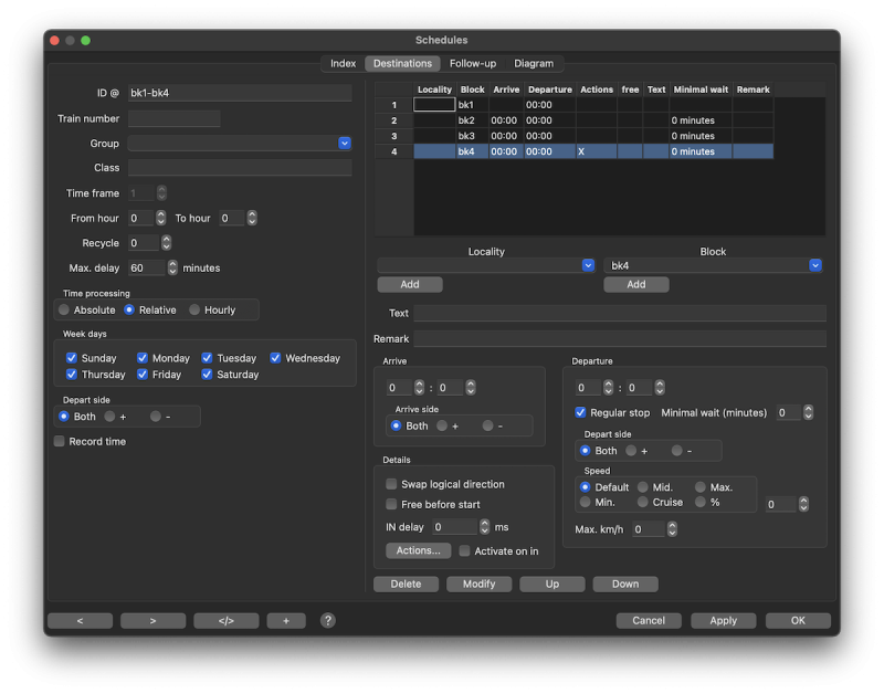 Example: With a schedule time of 00:01, the train departs on the minute after the schedule has been started. With a time of 16:10 the train will depart 16 hours and 10 minutes after the schedule has been started.