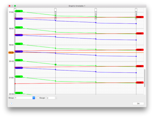 Het Tijd/Weg-diagram toont de grafische weergave van het gekozen dienstrooster.