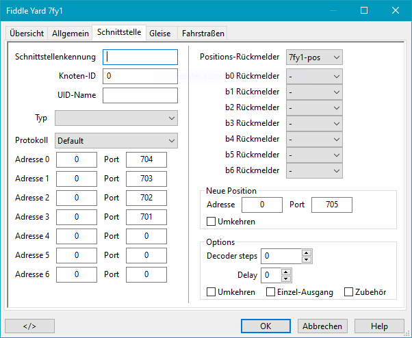 Mit diesem Rückmelder wird Rocrail gemeldet, dass die mit den Adressen 0 - 6 und dem Befehl Neue Position vorgegebene Position erreicht wurde.