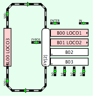 - Next move is to be automatically made as soon as you set to auto mode another loco. Don't forget to turn OFF 'FYPOS' before activating a different fiddle yard track with sensors 'b0' & 'b1', and then 'FYPOS' ON again.