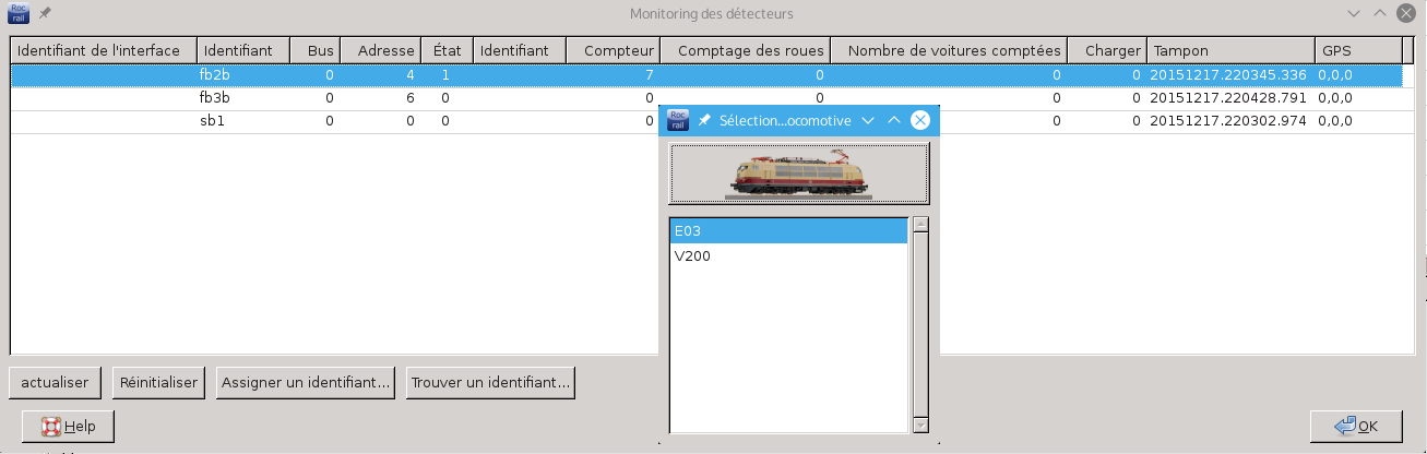 Il est recommandé d'activer seulement un nombre gérable de capteurs en un cycle. - Le moniteurs des détecteurs liste l'adresse reportée à Rocrail des détecteurs déclenchés.