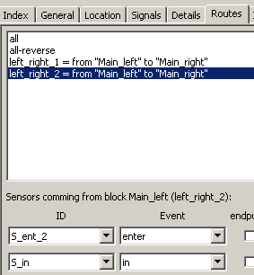 | enter2route¹ | Dit event is niet verbonden met een bezetmelder, maar wordt opgewekt na een in event uit het voorgaande blok. Voor treinen is dit event niet geschikt, maar is uitsluitend bedoeld voor Car systemen zoals Dinamo. |