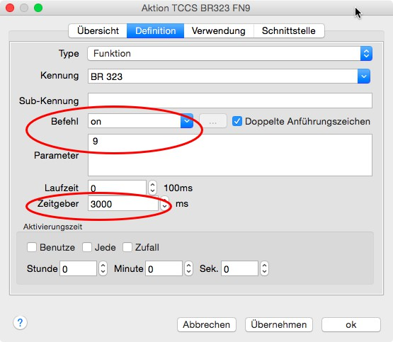 | Zeitgeber: | 3000 (Verzögert die Ausführung der Aktion um 3 Sek.. Dieser Wert hat sich in der Praxis bewährt, damit erst der Fahrregler auf 2 eingestellt wird und danach die Funktion abkuppeln ausgelöst wird) |