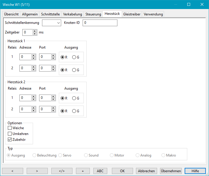 Bei Dekodern mit unterschiedlichen Port-Typen kann hier für die Steuerung der Herzstück-Polarisierung ein anderer Typ (z.B. 'Zubehör') ausgewählt werden, als im Schnittstellen-Dialog für den Weichen-Antrieb (z.B. 'Servo') eingestellt ist.