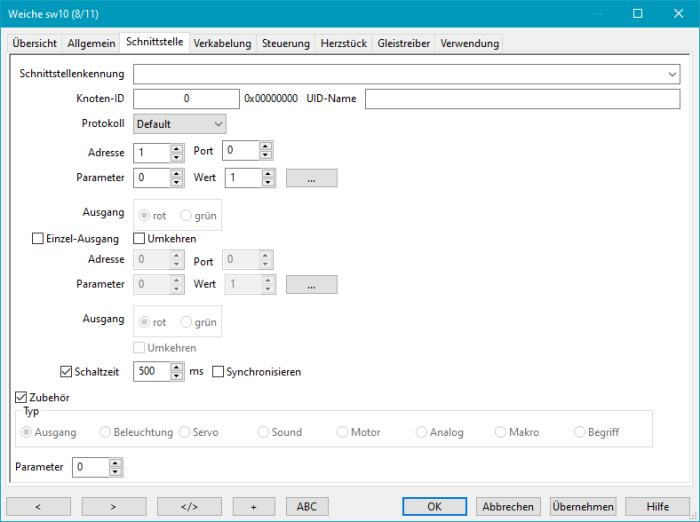 Wenn mehr als eine Zentrale verwendet wird, dann in diesem Feld die Zentrale angegeben, die für die Ansteuerung des Weichendekoders zuständig ist. Das Feld "Schnittstellenkennung" kann leer bleiben, wenn das Objekt mit der ersten Zentrale (erste 'digint' in der rocrail.ini) aus der Liste der Zentralen verbunden ist.