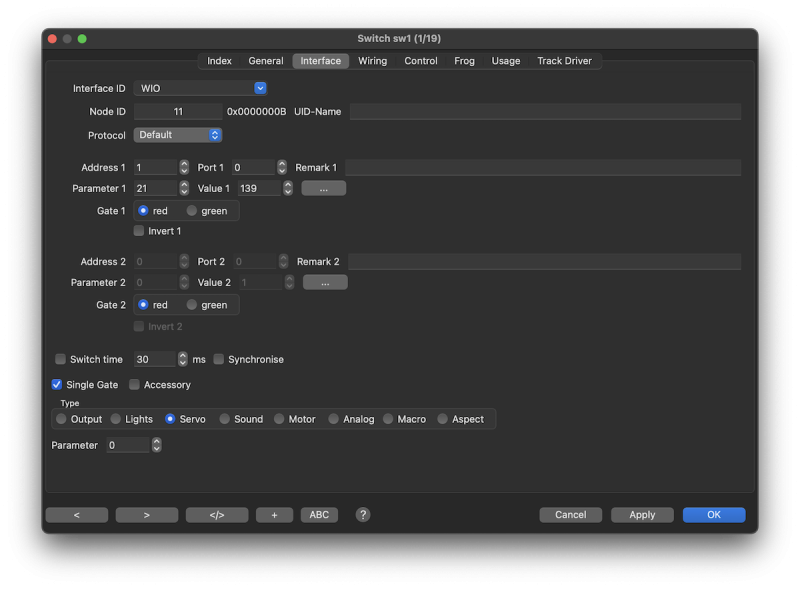If the switch is statically (crossing) or only manually controllable, the address and port can be set to zero. (This switch object must be included in routes which run over it.)
