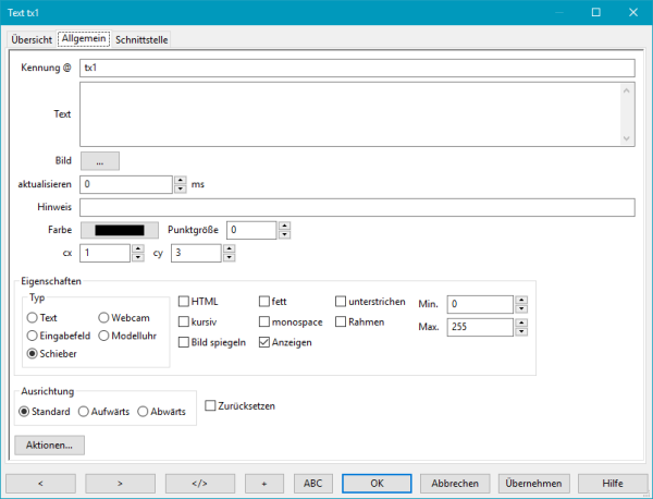 Die Eigenschaften "Min./Max." definieren die Werte für Anfang und Ende des Schiebeweges.