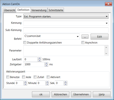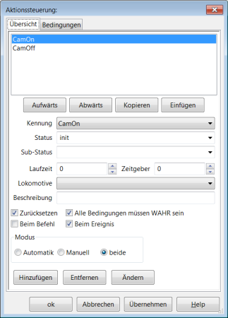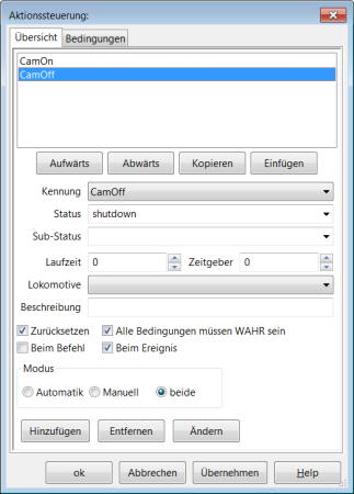In der Startphase von Rocrail wird beim System-Ereignis "init" das Bilderfassungs-Script CamOn.bat gestartet und bei "shutdown" wird die Bilderfassung mit Hilfe des Scripts CamOff.bat wieder bendet.