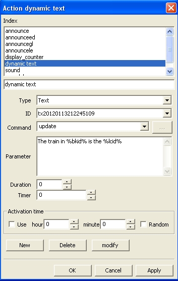 In the example above it would be the block for which the dynamic text will be updating with the loco ID. Therefore if the block that is being associated with the action is block LP1 and the next train to enter the block is 3MT, the text object would read "The train in LP1 is the 3MT".