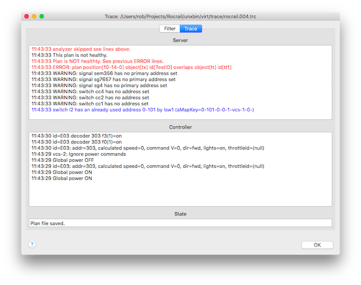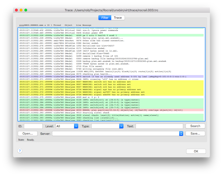 With this dialog Rocrail server trace files can be loaded and filtered to find out some problems in the automatic sequence or other issues.