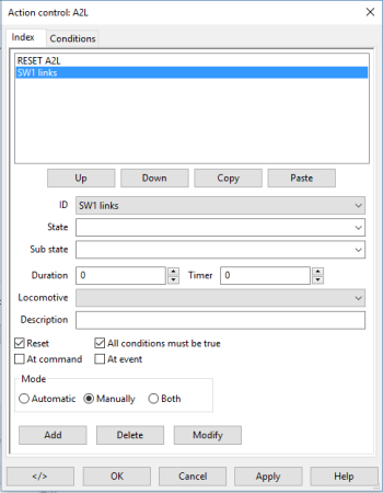 The action "SW1 Links (Left)" for turnout sw1 by output A2L (nomenclature: 2= Block 2, L= Left side) of the block.