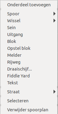 In "Bewerken" modus bied Rocrail in het context menu (Rechter muisknop) in het spoorplan de volgende spoortypes: